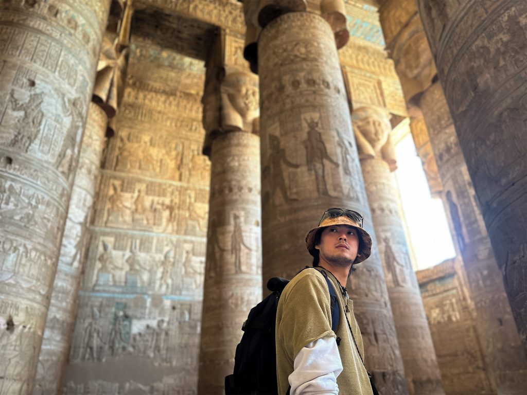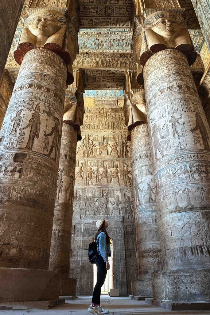 有24根約15公尺高的柱子,有特殊的「哈索爾柱頭」,精美的壁畫與雕刻,怎麼拍都好看,尤其色彩鮮豔的天花板,是絕無僅有的。