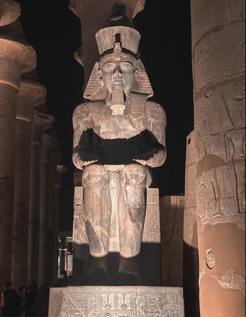羊是象徵太陽神阿蒙,同時也代表體力和繁殖力,兩腿之間則是雕刻神之子,拉美西斯二世。