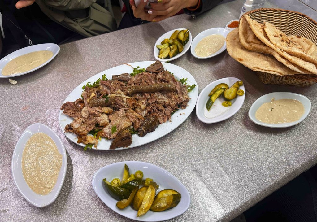 這是一間在地非常有名的小餐館,連跟我合照的大學生們,都是剛剛從餐廳走出來的呢!它以「煮羊肉」聞名,其實我平常不吃羊肉的,但是這家餐廳好吃到,我們四個人都吃了個停不下來,就像是,馬鈴薯配上奶油,產生了奇妙的化學變化,總而言之就是超級好吃!這應該是我們在埃及最美味Top 1。但是,顯然不是觀光客常去的,因為他們完全沒有菜單、也沒有人會講英文。他們的菜單似乎也只有一種,就是煮羊肉+醃黃瓜+鷹嘴豆醬+烤餅。