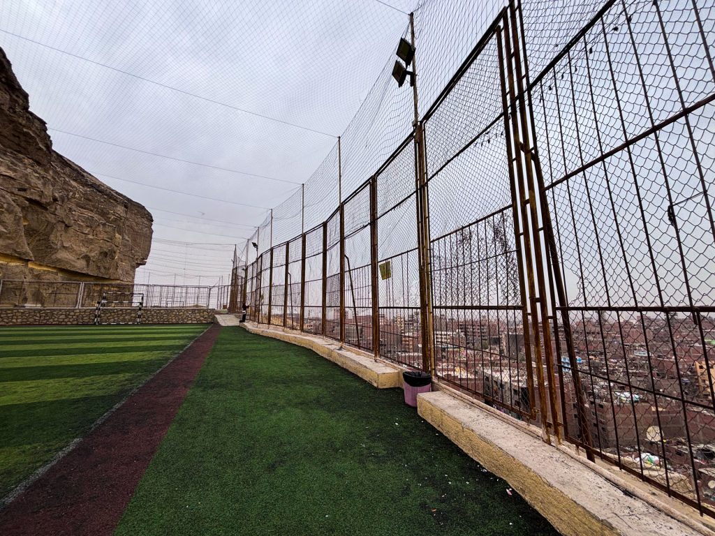 繼續往山坡上走,經過類似攀岩的遊樂場(?),一個小巷子,再來是樓梯一路往上,你會抵達一個籃球場,從這裡可以拍到垃圾城的全景。
